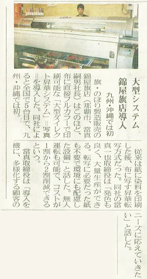 | 営業品目 | 旗、のぼり、国旗、学校旗、優勝旗、会社旗、市町村旗、大漁旗、安全旗、はっぴ、のれん、紅白幕,ちょうちん、座布団、腕章、タオル、手拭、横断幕、懸垂幕、立看板、簡易型看板 |