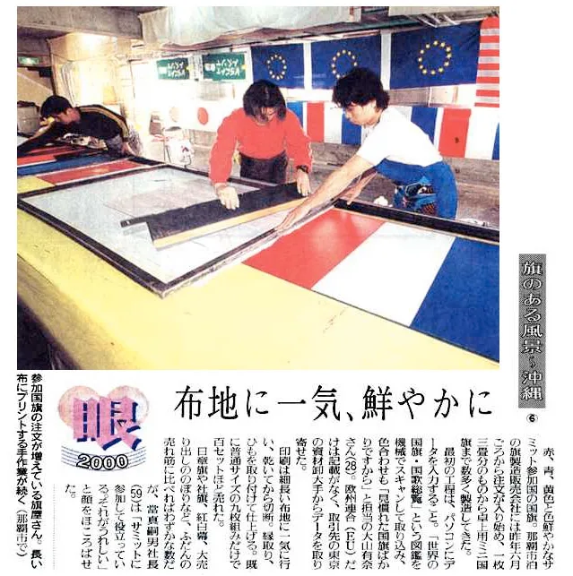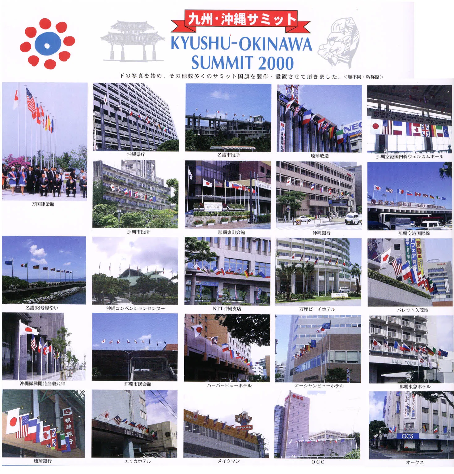 2000年(平成12年)7月21~23日、九州・沖縄サミット首脳会議が沖縄で開催され、当店では首脳会議の開かれた万国津梁館を始め、多数の参加国の国旗製作・設置させて頂きました。ここではその一部の画像を掲載しております。